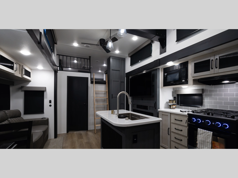 Sleeps 8 Slides 3 Length 43 ft 1 in Ext Width 8 ft Ext Height 13 ft 4 in Hitch Weight 1425 lbs GVWR 14689 lbs Dry Weight 12889 lbs Cargo Capacity 1800 lbs Fresh Water Capacity 43 gals Grey Water Capacity 70 gals Black Water Capacity 70 gals Available Beds King Refrigerator Type Residential Style Convection Cooking Yes Cooktop Burners 4 Shower Size 32" x 40" Number of Awnings 1 LP Tank Capacity 30 lbs Water Heater Type Tankless TV Info LR Smart TV Awning Info 21' Axle Count 2 Washer/Dryer Available Yes Number of LP Tanks 2 Shower Type Standard Electrical Service 50 amp Similar Floorplans