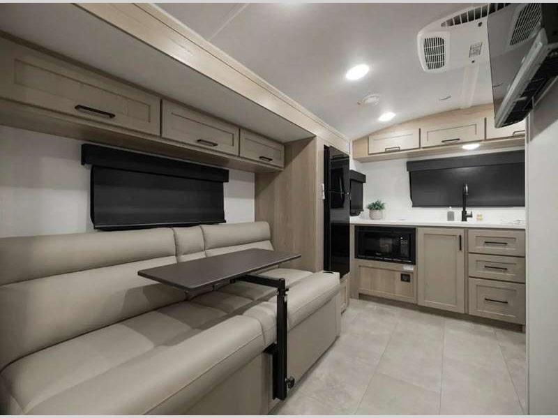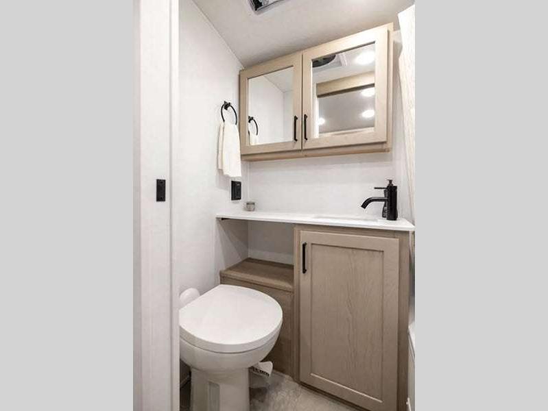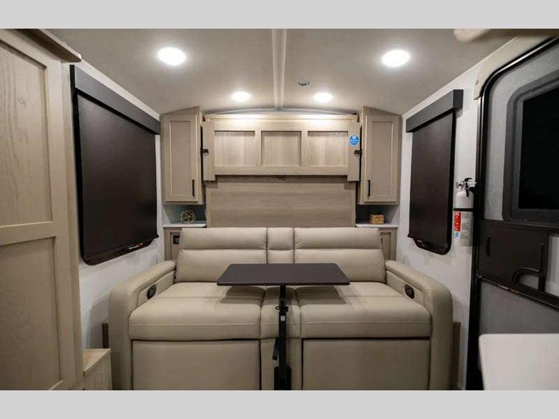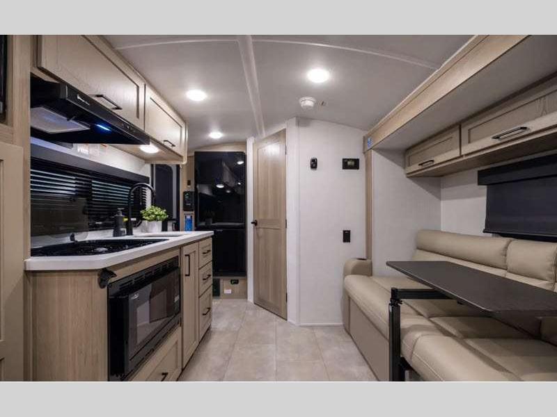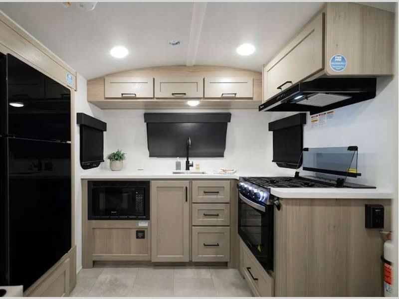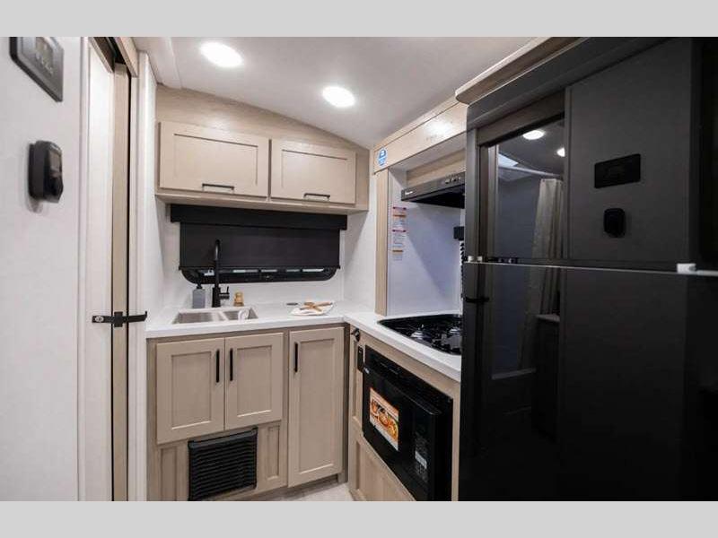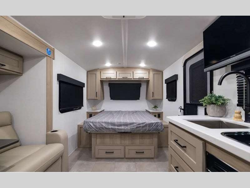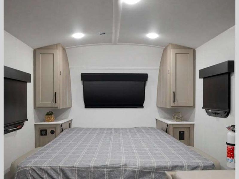 The complete composite wall construction and frameless widows provide a durable and sleek travel trailer you are sure to love. Each model features bigger nitrogen-filled tires and standard solar power that will allow you to go off-grid when the adventure calls for it. A refrigerator also comes standard, along with back-up camera prep, laminated roof, and more at-home comforts. And if you want to go off-grid, optional sunset seeker package is available on select models!