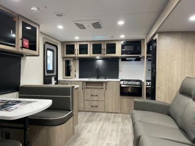 The gel-coated fiberglass exterior and one-piece roof membrane form the base that holds all of the many features, like the three-burner range with an oven, residential walk-in shower, high capacity furnace, and LED HDTV. The friction-hinge entry door won't fly away when you open it, and the residential countertops will let you set down dinner plates. There is a large panoramic window and LED lighting to keep your trailer feeling open, and the four packages included will provide even more features you won't want to camp without. Some of these features include a 200W solar panel, a 2" accessory hitch, and a full width pass-thru storage!