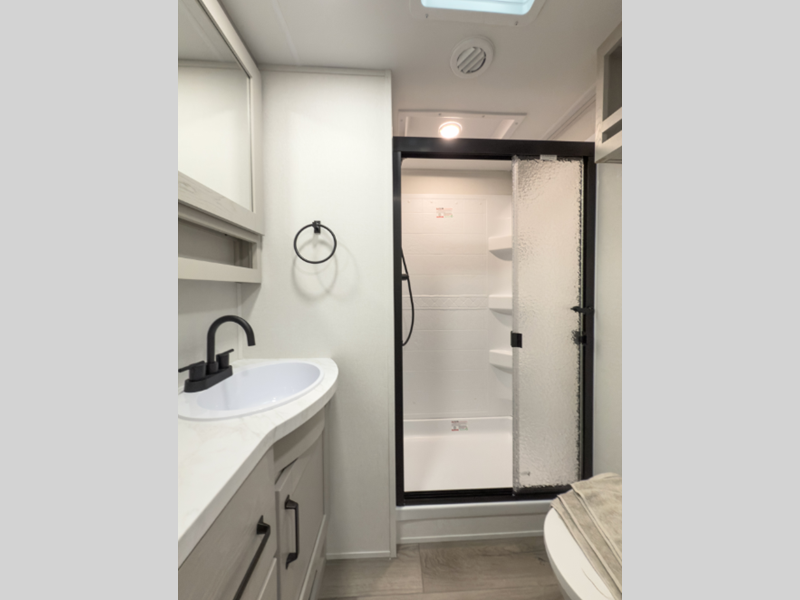 Sleeps 3 Slides 1 Length 30 ft Ext Width 8 ft Ext Height 12 ft Hitch Weight 950 lbs GVWR 9995 lbs Dry Weight 7664 lbs Fresh Water Capacity 55 gals Grey Water Capacity 78 gals Black Water Capacity 39 gals Tire Size ST225/75R15 LRE Furnace BTU 30000 btu Available Beds Queen Refrigerator Type 12V Refrigerator Size 10 cu ft Cooktop Burners 3 Shower Size 30" x 36" Number of Awnings 1 LP Tank Capacity 30 lbs Water Heater Type On Demand Tankless TV Info LR 40" High-Definition LED TV Awning Info 19' One Touch Electric LED Axle Count 2 Number of LP Tanks 2 Shower Type Walk-In Shower Electrical Service 50 amp Similar Floorplans