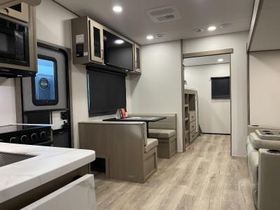You will love this fifth wheel’s multiple sleeping spaces, such as the 36” flip top bunk offers flexible sleeping options for added capacity and comfort. A trundle bed provides an additional cozy sleeping space, ideal for guests or family members, and the 44” bunk bed with window features a comfortable sleeping area with natural light, ideal for kids or relaxation. Plus, the front bedroom boasts a queen bed, creating a peaceful retreat for rest and rejuvenation. In the living area, you will find a space that creates a warm and intimate spot for meals and conversation. The 40” TV delivers entertainment for relaxation and enjoyment, a theater seating provides immersive comfort for an exceptional viewing experience, and the well-appointed kitchen features a 10 cu ft refrigerator that ensures ample storage for fresh ingredients and beverages, a pantry, microwave, and a three-burner cooktop allows for versatile meal preparation. Finally, the full bathroom will complete the at-home experience, adding convenience to this model.
