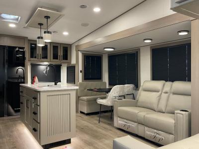 Sleeps 5 Slides 3 Length 34 ft 9 in Ext Width 8 ft Ext Height 12 ft 6 in Hitch Weight 2200 lbs GVWR 13995 lbs Dry Weight 11100 lbs Fresh Water Capacity 74 gals Grey Water Capacity 94 gals Black Water Capacity 47 gals Tire Size ST235/80R16RLE Furnace BTU 35000 btu Available Beds Queen Refrigerator Type 12V Refrigerator Size 16 cu ft Cooktop Burners 3 Shower Size 30" x 48" Number of Awnings 2 LP Tank Capacity 30 lbs Water Heater Type On Demand Tankless AC BTU 15000 btu TV Info LR 40" TV Awning Info 16' & 10'6" One-Touch Electric LED Axle Count 2 Washer/Dryer Available Yes Number of LP Tanks 2 Shower Type Standard Electrical Service 50 amp Similar Fifth Wheel Floorplans