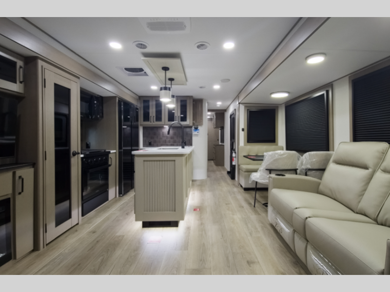 Sleeps 5 Slides 2 Length 35 ft 5 in Ext Width 8 ft Ext Height 11 ft 11 in Hitch Weight 1145 lbs GVWR 10995 lbs Dry Weight 9518 lbs Fresh Water Capacity 55 gals Grey Water Capacity 78 gals Black Water Capacity 39 gals Tire Size ST225/75R15LRE Furnace BTU 35000 btu Available Beds Queen Refrigerator Type 12V Refrigerator Size 16 cu ft Cooktop Burners 3 Shower Size 30" x 48" Number of Awnings 1 LP Tank Capacity 30 lbs Water Heater Type On Demand Tankless AC BTU 28500 btu TV Info LR 40" LED HDTV Awning Info 12' One-Touch Electric LED Axle Count 2 Washer/Dryer Available Yes Number of LP Tanks 2 Shower Type Standard Electrical Service 50 amp Solar Wattage 180 watts Similar Floorplans