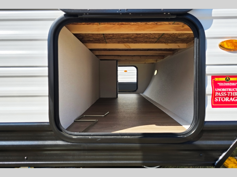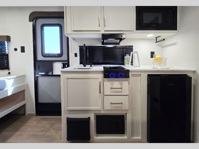 Each model is constructed to a superior standard with an insulated floor and enclosed underbelly plus residential insulated walls that will help with temperature regulation and moisture control. The 6' 6" interior height, tinted windows, and residential cabinet doors will make your space feel a little more like home, and the black automotive glass entry door is ultra sleek. You will find a power awning with a Fusion light outside, along with magnetic storage door catches, a Leash Link/bottle opener, and more convenient features!