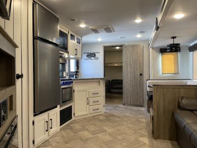 There's a comfortable place to sleep for the whole family in this travel trailer! The rear private bunkhouse has a set of 28" x 76" bunk beds, a 28" x 65" bunk above a sofa, and a wardrobe with an entertainment center above it so they can bring a cousin or two to join in on the fun. You will have your own privacy with the front private bedroom which has a queen bed with shirt closets on either side of it. The spacious full bathroom has a 34" x 34" radius shower for everyone to freshen up and one of the entrances leads directly outside so you can get back to having fun fast. Prepare your best home cooked meals indoors with the walk-in pantry, the three burner cooktop, and the 12V refrigerator. Plus, there is a U-shaped dinette to enjoy your meals and even transform into an extra sleeping space! Choose the optional mini outside kitchen for even more convenience!